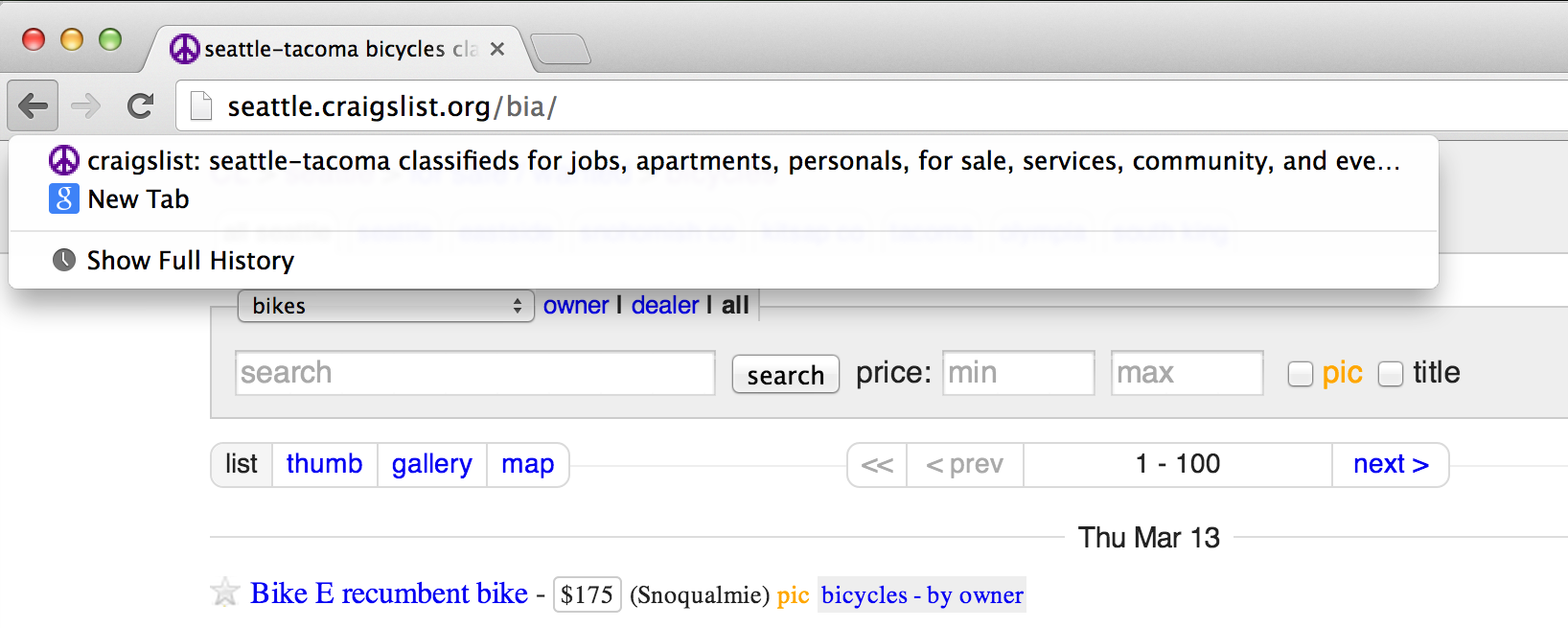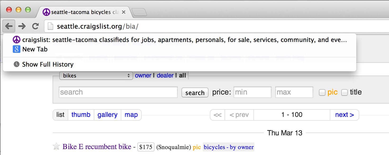 To get a better idea of what I’m talking about, lets look at an example. Lets suppose you are looking for a new bike on craigslist, so you bring up the bicycles page of craigslist and start looking through the listings. At this point your back button menu will look like:
