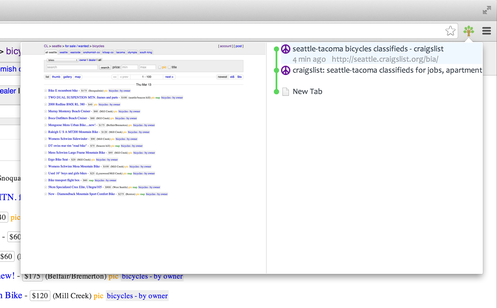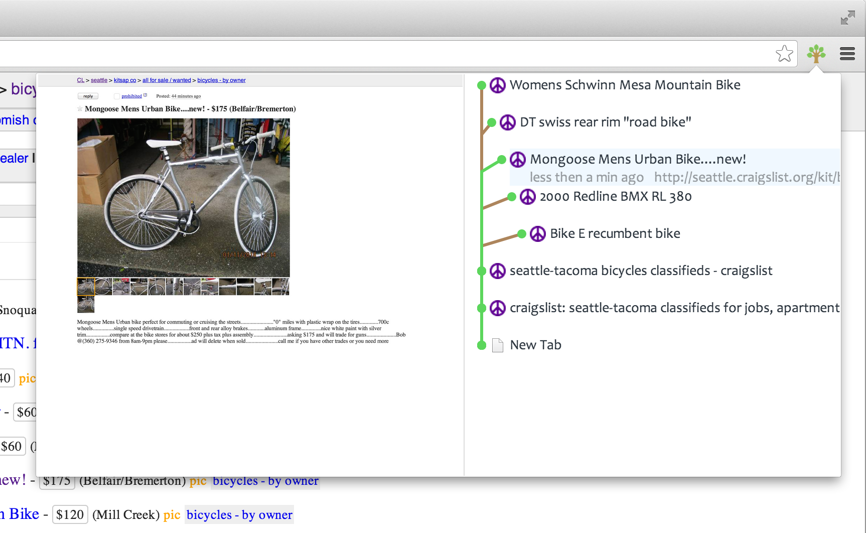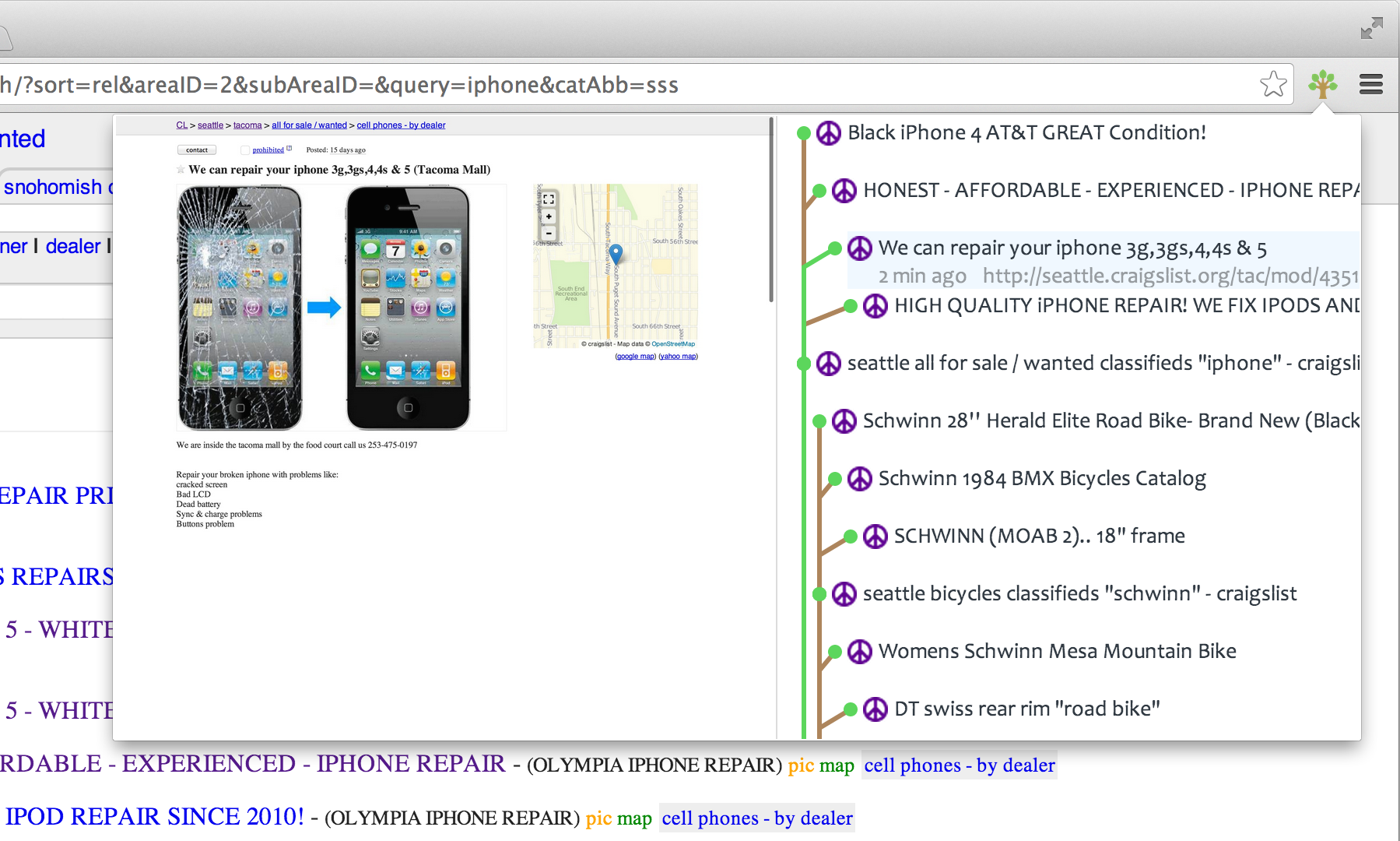 So now if you want to go back to any of those listing you visited in the past, they are right there in your histree! Histree even supports nested branches, so if for example you were to start searching for an iPhone on craigslist, you would still have your old bike search branch stored as a nested branch under your iPhone branch: